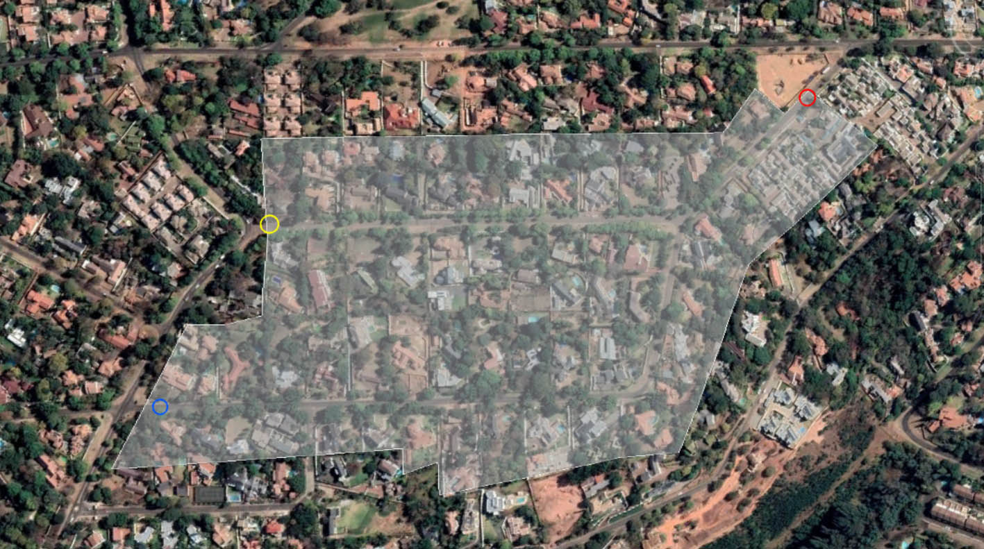 To have complete access control for vehicles and pedestrians at all 3 entrances (Jupiter, Regulus, and Grus) to the JRG residents association security initiative area (see picture) by means of guarded and non-guarded gates with cctv and numberplate reading cameras equipped with artificial intelligence for off site monitoring. Effective armed response and back up support both on and off site. All in all resulting in a safe and sought after closed area for current and future home owners that functions effectively year in and year out without being dependent on any specific current residents.