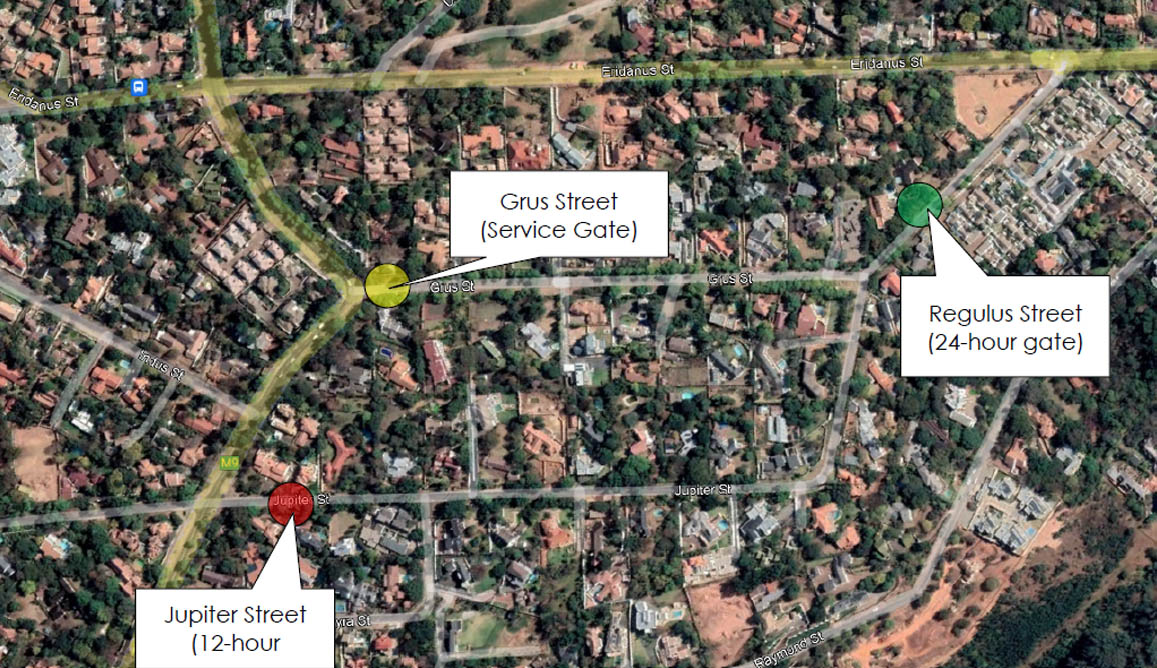 More and more areas and neighbourhoods around us are formally closing down and becoming gated communities with complete access control. Most recently the SAFEWATERKLOOF closure initiative started with construction of their gates and guard houses and has resulted in the residents of the JRG streets area to also want more formal/permanent closure of our 3 entrances with gates (Grus, Jupiter on Rigel str and Regulus on Eridanus str) with enhanced and more strict access control. The main reasons being the real possibility of crime displacement from the very large adjacent safeWaterkloof initiative and also an increase in house breaking tendencies in the neighbourhoods.